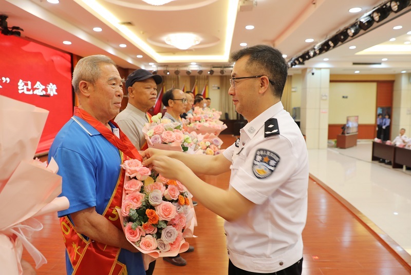 活动现场首先举行了庄重的“光荣在党50年”纪念章颁发仪式。青年民辅警向老党员献花致敬,象征着公安事业的薪火相传。龙校为党龄满50年的老党员代表逐一佩戴纪念章,感谢他们一直以来为党和公安事业作出的贡献。熠熠生辉的纪念章承载着老党员们的忠诚信仰,也激励着年轻民辅警接续奋斗。