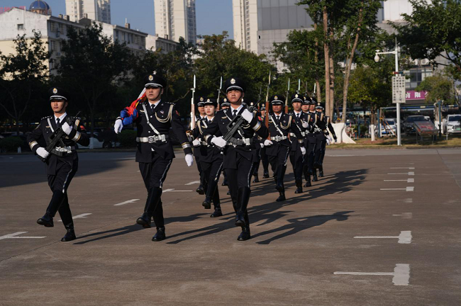 上午8点30分,伴随着嘹亮的《中国人民警察警歌》,中国人民警察警旗迎着晨风和朝阳徐徐升起,全体民辅警精神抖擞,整齐肃立,目光紧紧追随飘扬的旗帜,庄严敬礼。随后,大家高举右拳,重温入警誓词,“我志愿成为中华人民共和国人民警察……”铿锵有力的誓言回荡在广场上空。