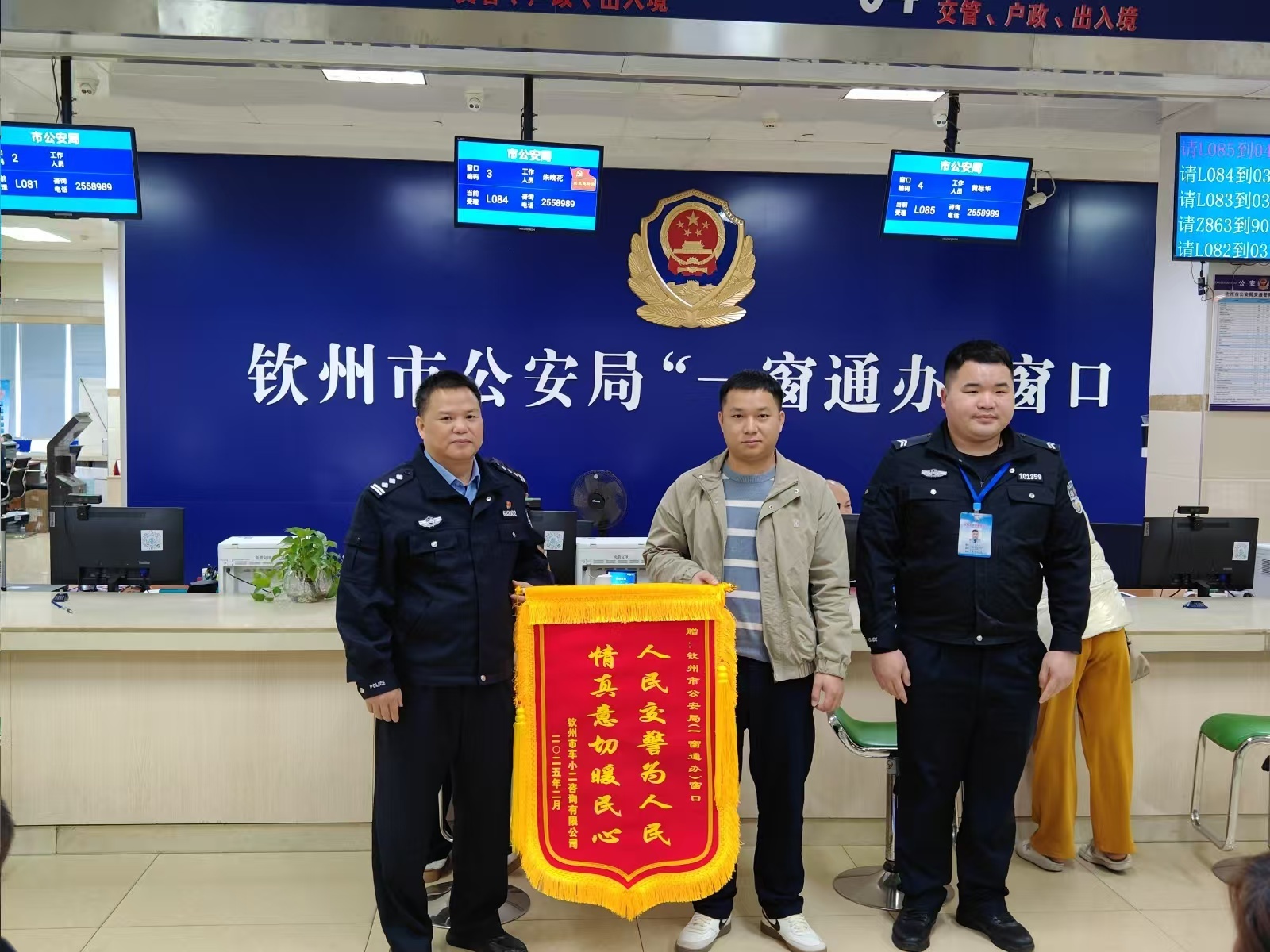 2025年2月24日下午,一位市民手捧一面锦旗步入市政务服务中心公安“一窗通办”窗口,将印有“人民交警为人民 情真意切暖民心”的锦旗递到了办事人员的手中,以此表达对钦州市公安局热情服务高效服务的充分肯定和感激之情。事情的原委是这样的:市民李先生经常要为单位和个人代理车辆解押抵押业务,多次到市政务服务中心“一窗通办”窗口办理相关车辆解押抵押业务,每次来窗口办理业务工作人员都微笑服务、耐心解答,他感受到了公安窗口服务的温暖和高效。李先生说:“公安窗口工作的同志尽职尽责,以往办理业务我都要跑各个不同窗口,现在一个窗口就能办理,给我们企业、群众提供了便捷,为我们节省了很多时间,特别感谢他们的辛勤付出。”
