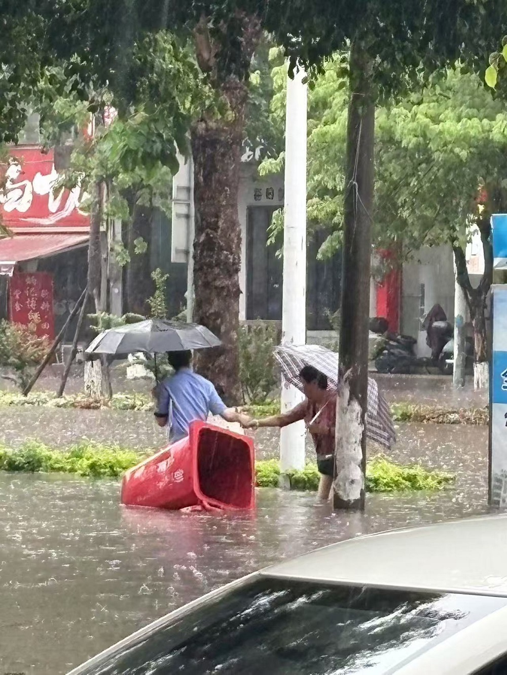 11时58分,钦州市公安局巡警支队3号警务站接到群众报警,称在新华路与明阳街交界有一老人被困在三轮车内,需要派警救助。民警迅速赶到现场,找到被困老人。经了解,由于持续暴雨导致路面积水快速上涨,老人驾驶的三轮电动车因泡水后无法启动,被困路中央,无法离开。此时街道的水位还在持续上涨,民警不顾个人安危,迅速将老人从车内搀扶出来,转移至地势较高的安全地带。考虑到老人安全,民警决定驾驶警车护送老人回家。老人对民警的及时救助表示感谢。