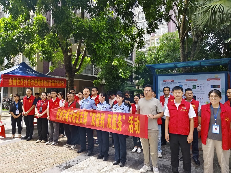 钦州市看守所党支部积极落实“双报到双服务”机制,7月2日上午,组织党员民辅警联合山塘社区居委会干部及社区志愿者共50余人深入阳光家园小区开展了一场声势浩大的打击治理电信网络诈骗主题宣传活动。