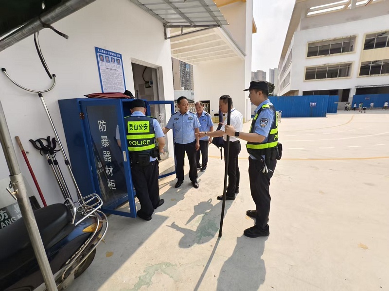 检查中,民警坚持"不留盲区、不漏一处"原则,重点围绕两大核心内容逐项核验:一是消防安全设施。对教学楼、楼道、功能室、食堂等重点区域的消防栓进行全面检查,仔细查看水压是否正常、配件是否齐全、水带水枪是否完好有效;逐一核查灭火器压力、有效期与摆放位置,测试应急照明、疏散指示标志是否正常,确认疏散通道、安全出口是否畅通,严查私拉乱接电线、违规用电等隐患。二是防爆安防设施。对校园门卫室、出入口的防爆装备进行现场查验,核对防暴盾牌、钢叉、头盔、橡胶棍等器材是否配齐配足、完好可用;测试一键报警装置、视频监控系统运行状态,检查门禁管理、外来人员登记等制度落实情况,督促安保人员熟练掌握应急处置流程。