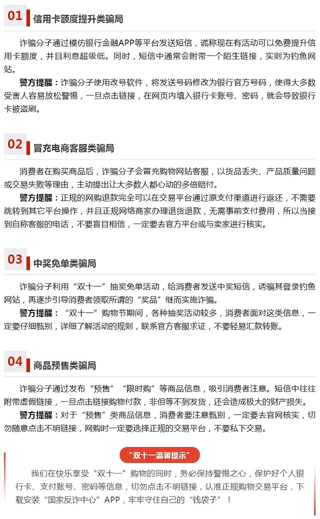 “双十一”又来啦!各大电商摩拳擦掌,准备掀起促销网购狂潮,诈骗分子也大范围撒网,伺机实施诈骗。今天为大家整理了一份“双十一”购物防骗指南,让大家放心买买买!