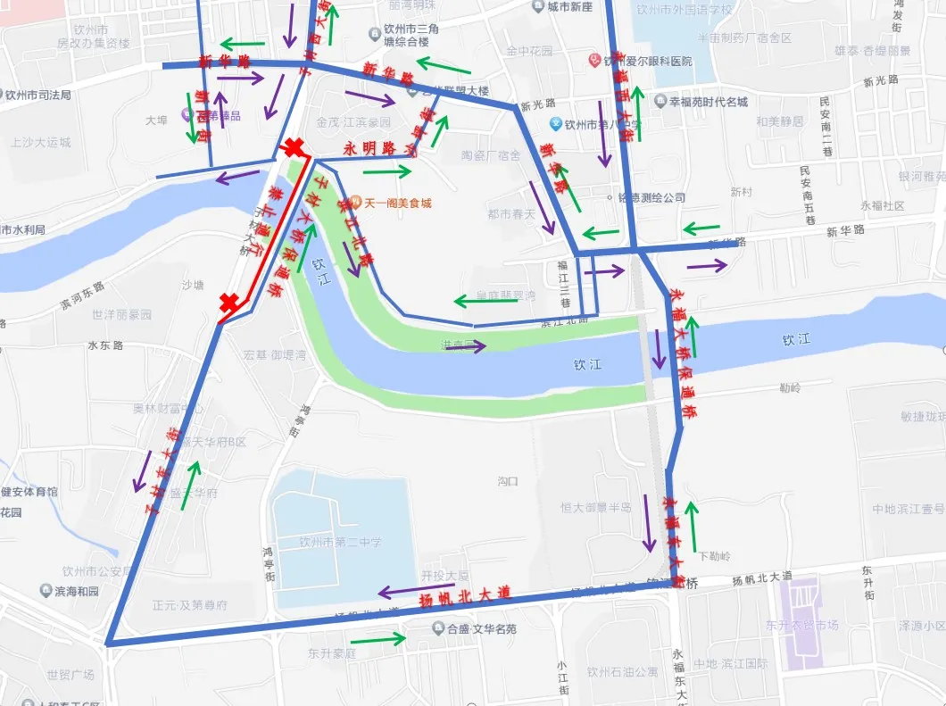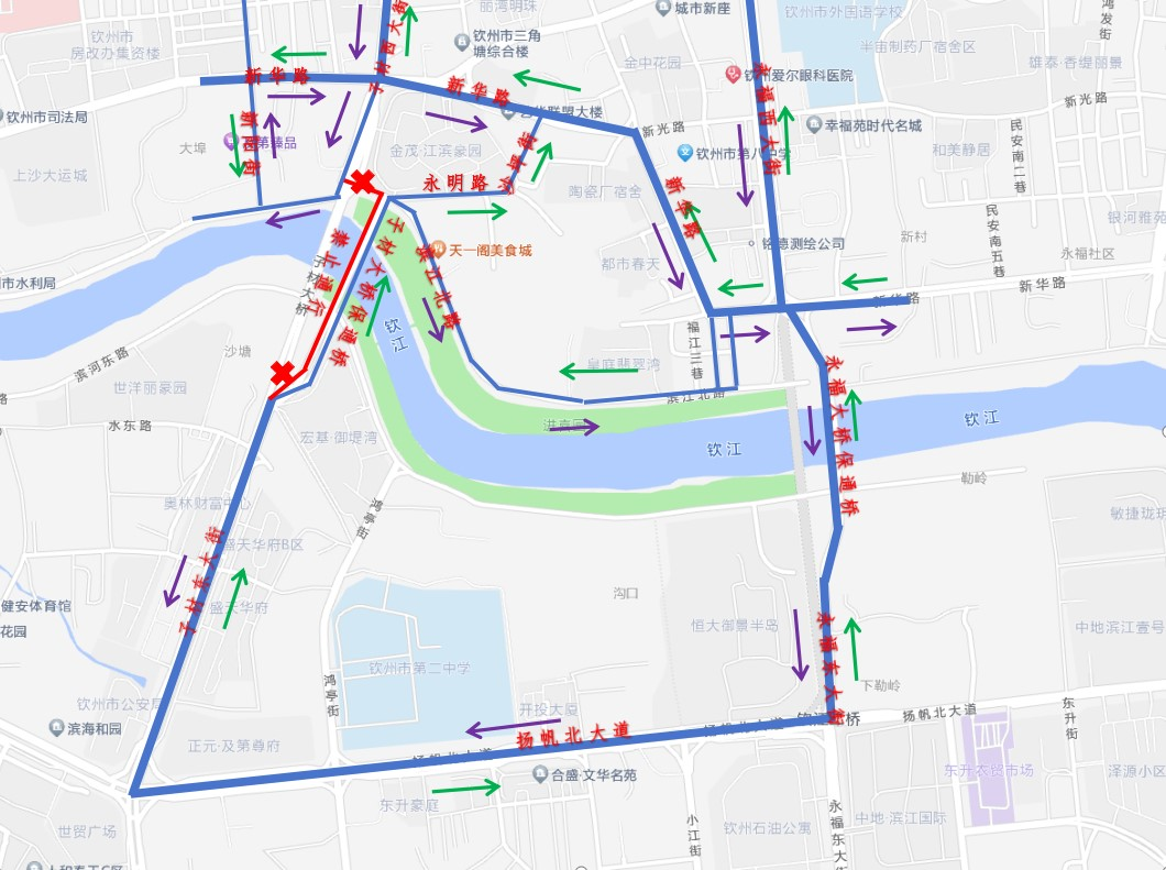 因子材大桥保通桥西岸路段道路修复施工需要,根据《中华人民共和国道路交通安全法》及实施条例的有关规定,现决定对子材大桥保通桥西岸路段实施交通限制措施,具体通告如下:2024年8月6日23:00开始,预计至8月7日6:00结束。对子材大桥保通桥西岸路段南侧实施半幅路面封闭施工,由东往西单向通行,禁止一切车辆由西向东通行。子材西大街往子材东大街方向:子材西大街—新华路—永福大桥保通桥—永福东大街—扬帆大道—子材东大街。请行经交通限制区域的车辆驾驶人按交通标志、标线的指示行驶,注意减速慢行或绕行,服从现场交通管理人员的指挥、疏导。因实施交通限制措施带来的出行不便,敬请社会各方谅解。中交第二公路工程局有限公司